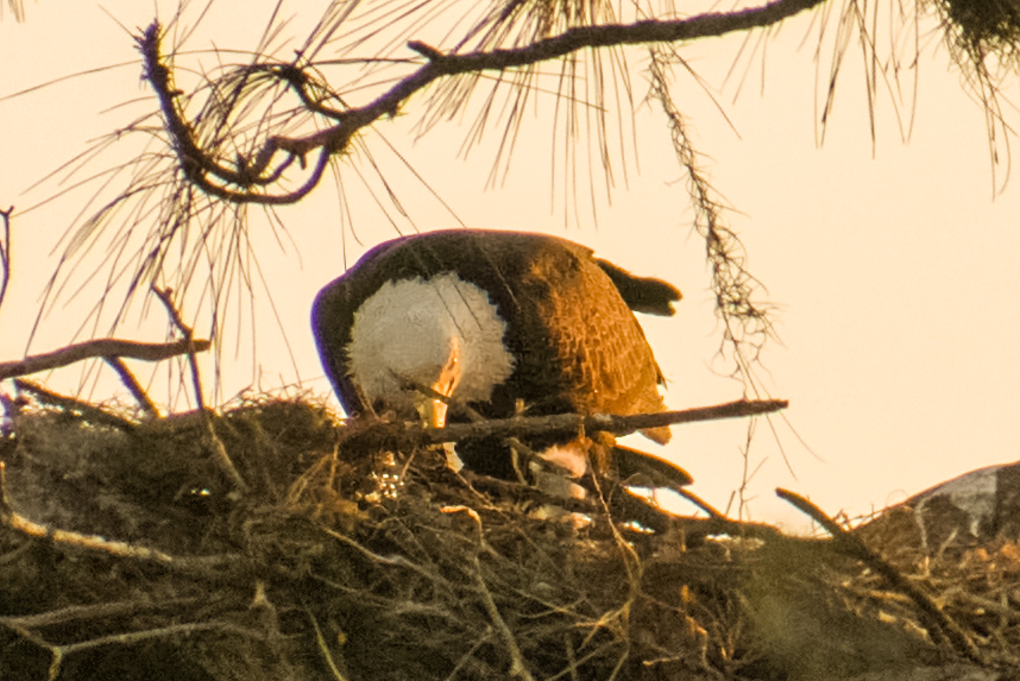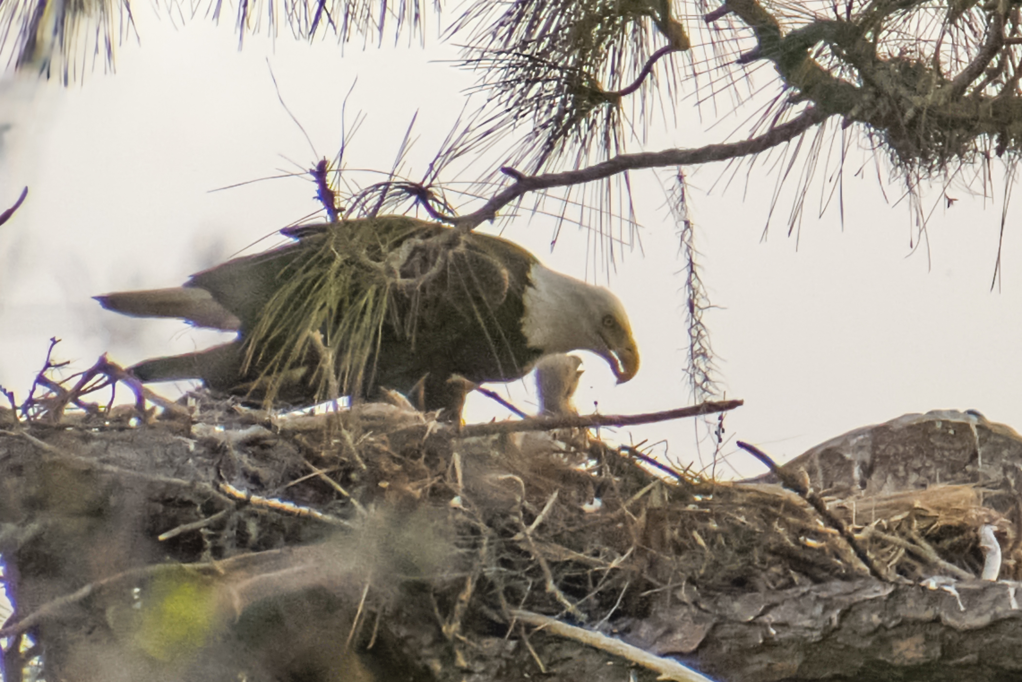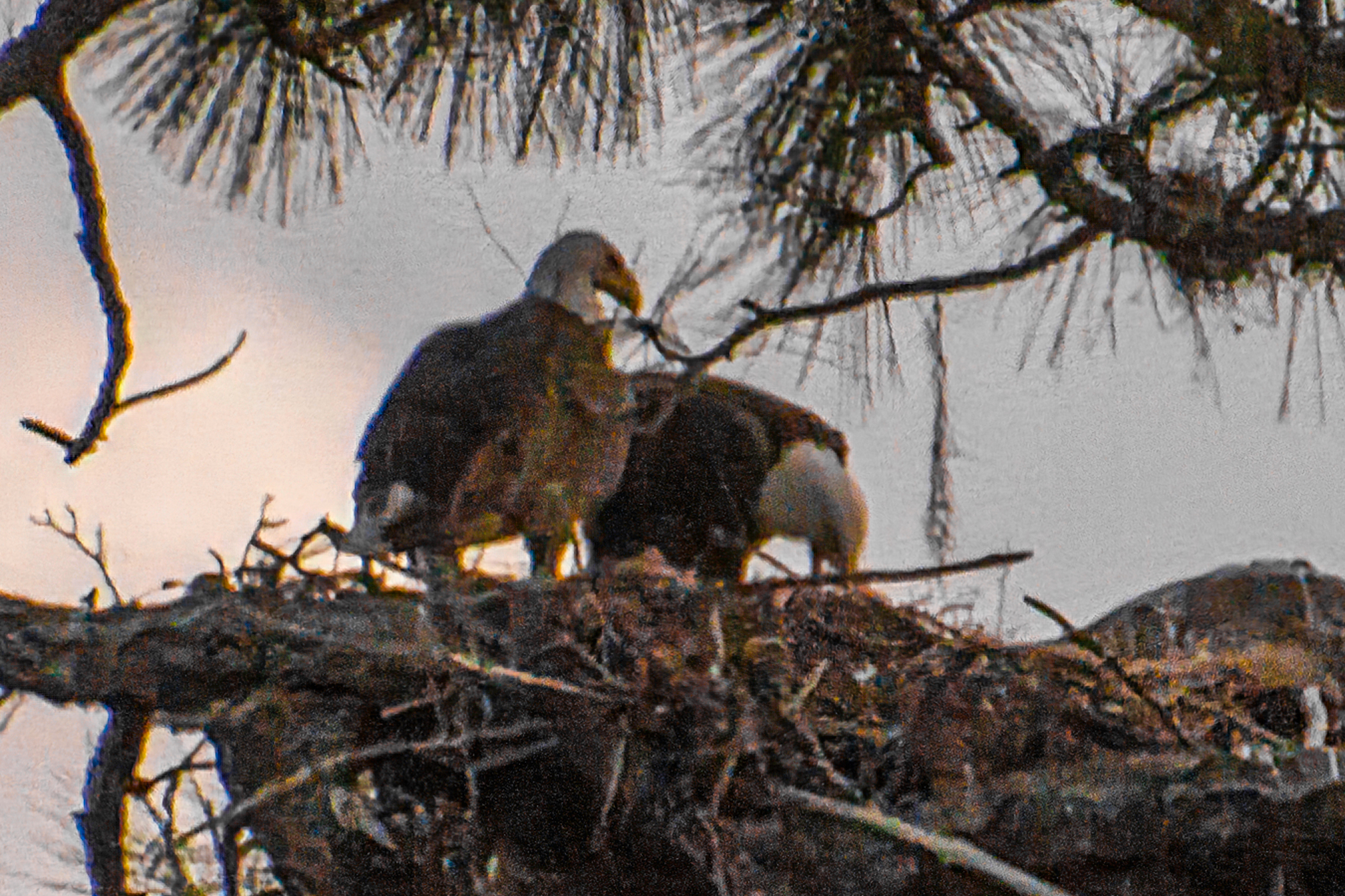 Curiosity continues to reign supreme with questions about “our” Bald Eagles. Every day, more and more CF neighbors stop down to check on the nest. Yes, we have two little eaglets that you might be able to see if you are watching at the right time–usually breakfast or dinner. Eagles tend to feed in the morning and close to sunset in the evening. As you can imagine, it’s usually pure luck to see one or both of the eaglets popping up their little heads. Their size, and when they first were seen, does confirm that the first egg was laid on or the day after Christmas Day! Most of these photos were taken with a 400mm lens, and they are closely cropped from hundreds of photos, in which only a few have visible eaglets. Most were also taken near or after sunset, so please ignore the photo noise.