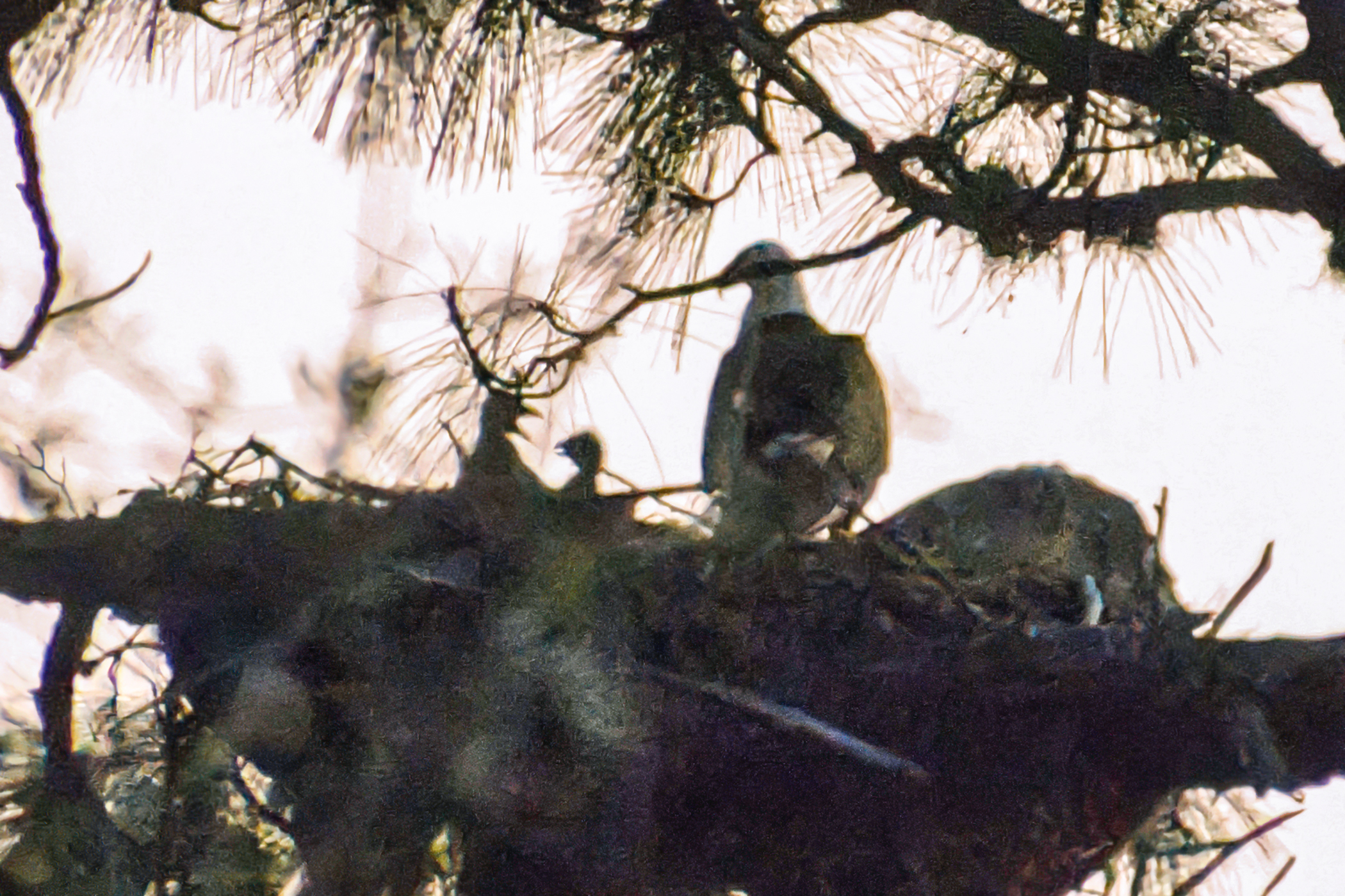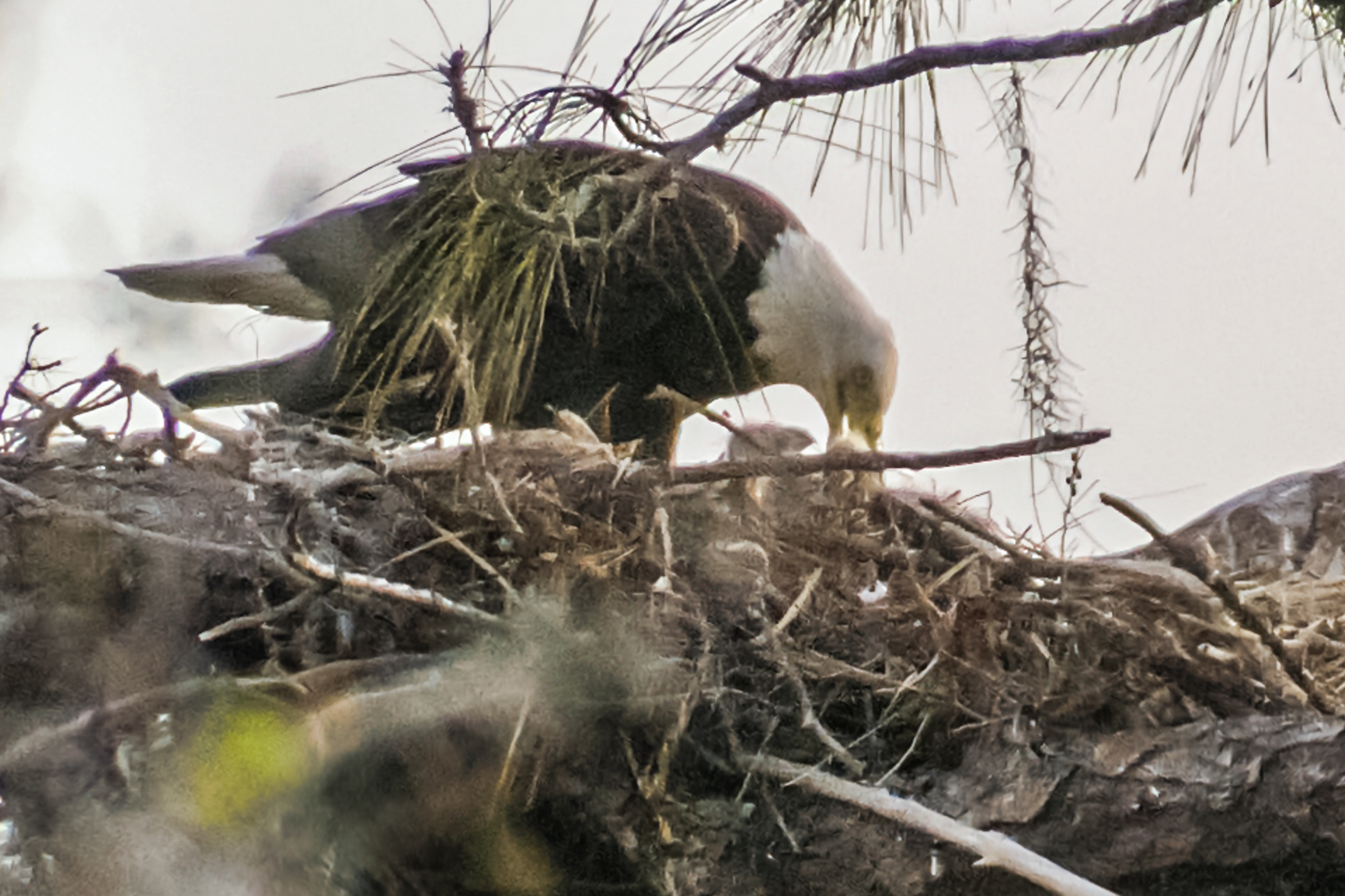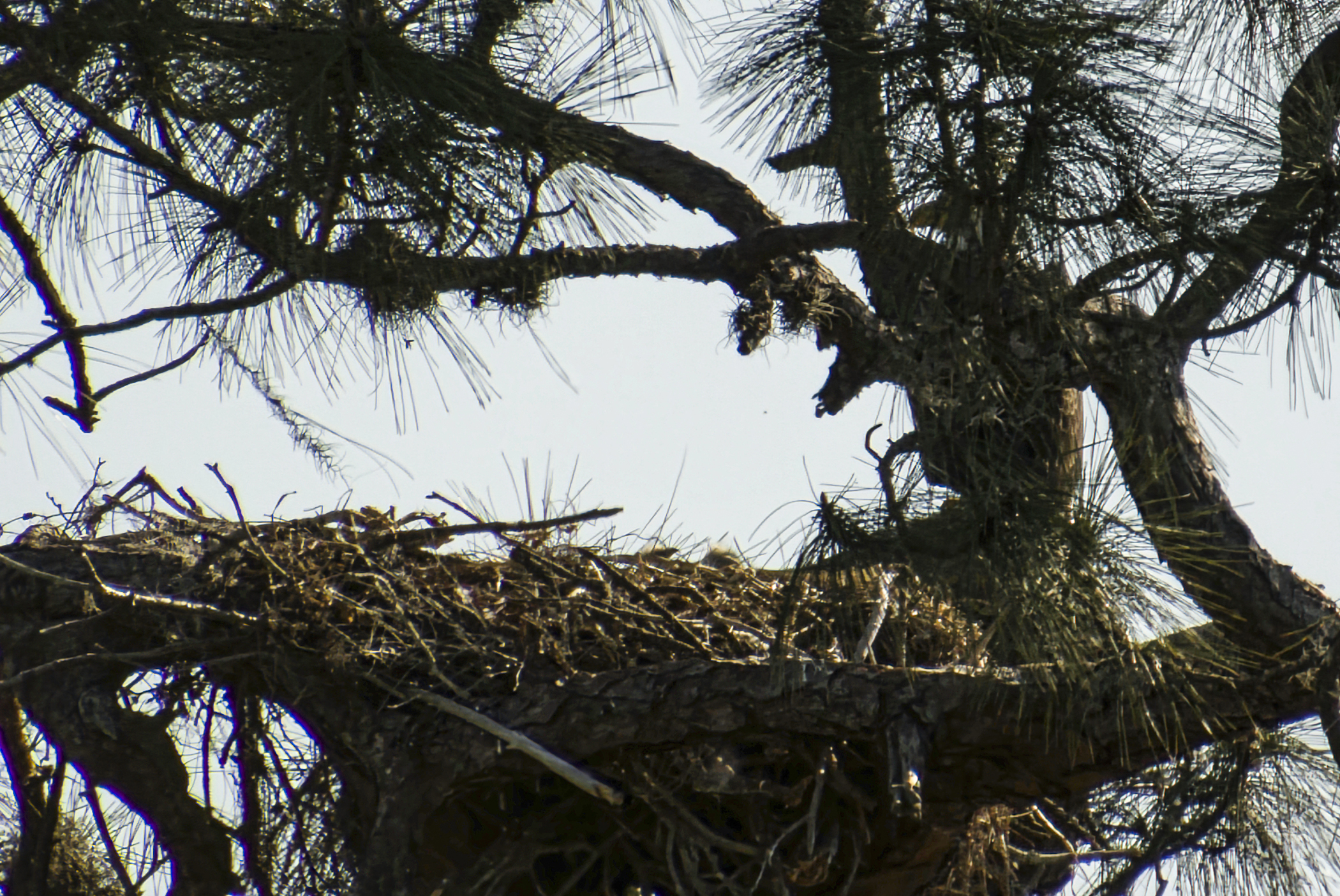 Curiosity continues to reign supreme with questions about “our” Bald Eagles. Every day, more and more CF neighbors stop down to check on the nest. Yes, we have two little eaglets that you might be able to see if you are watching at the right time–usually breakfast or dinner. Eagles tend to feed in the morning and close to sunset in the evening. As you can imagine, it’s usually pure luck to see one or both of the eaglets popping up their little heads. Their size, and when they first were seen, does confirm that the first egg was laid on or the day after Christmas Day! Most of these photos were taken with a 400mm lens, and they are closely cropped from hundreds of photos, in which only a few have visible eaglets. Most were also taken near or after sunset, so please ignore the photo noise.