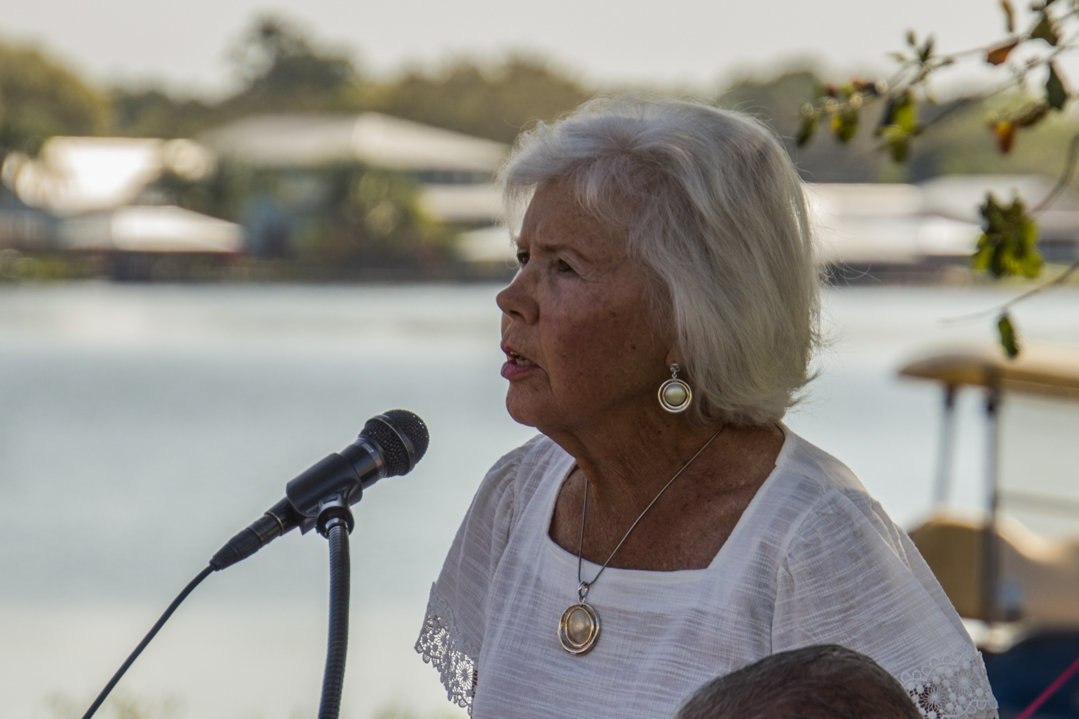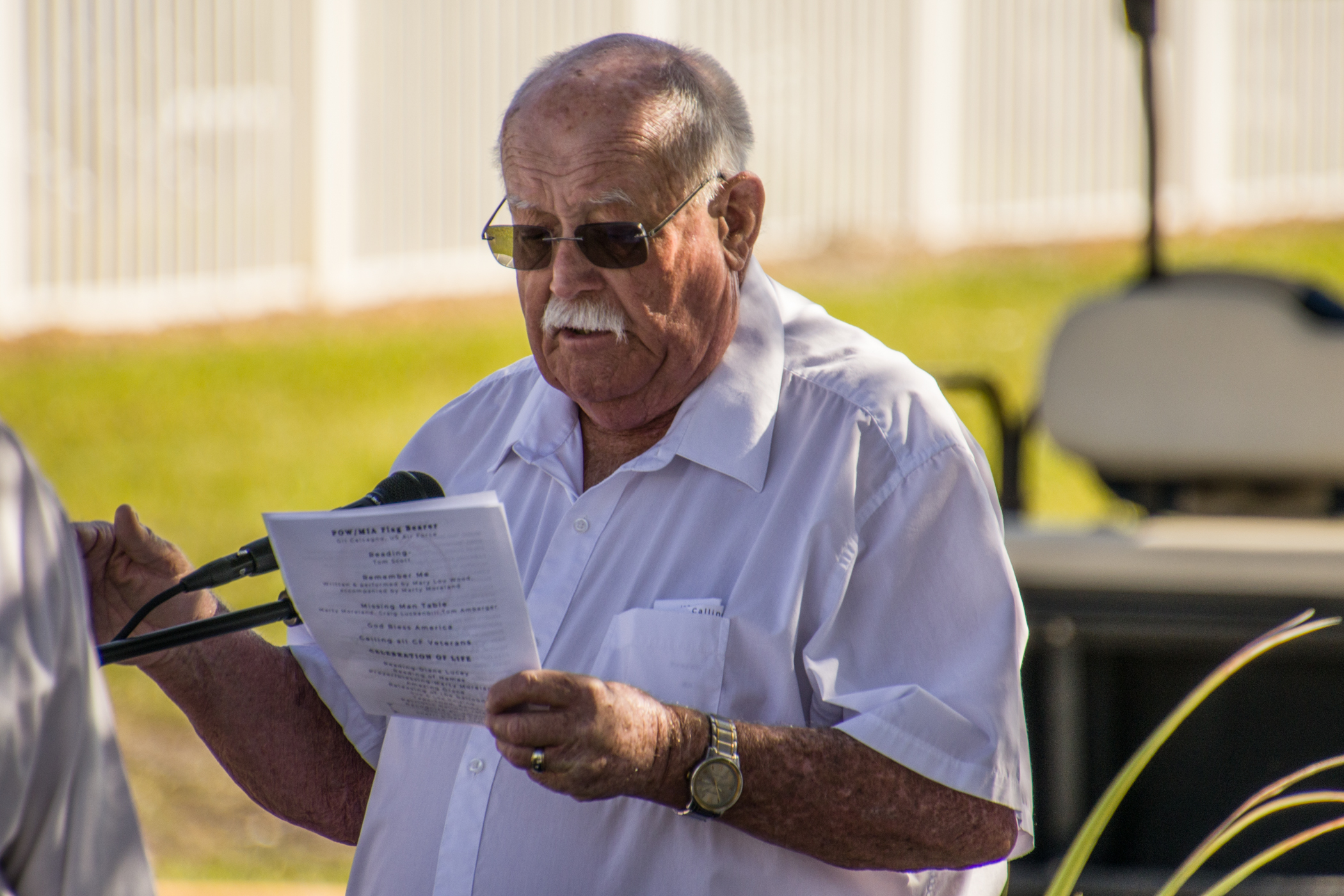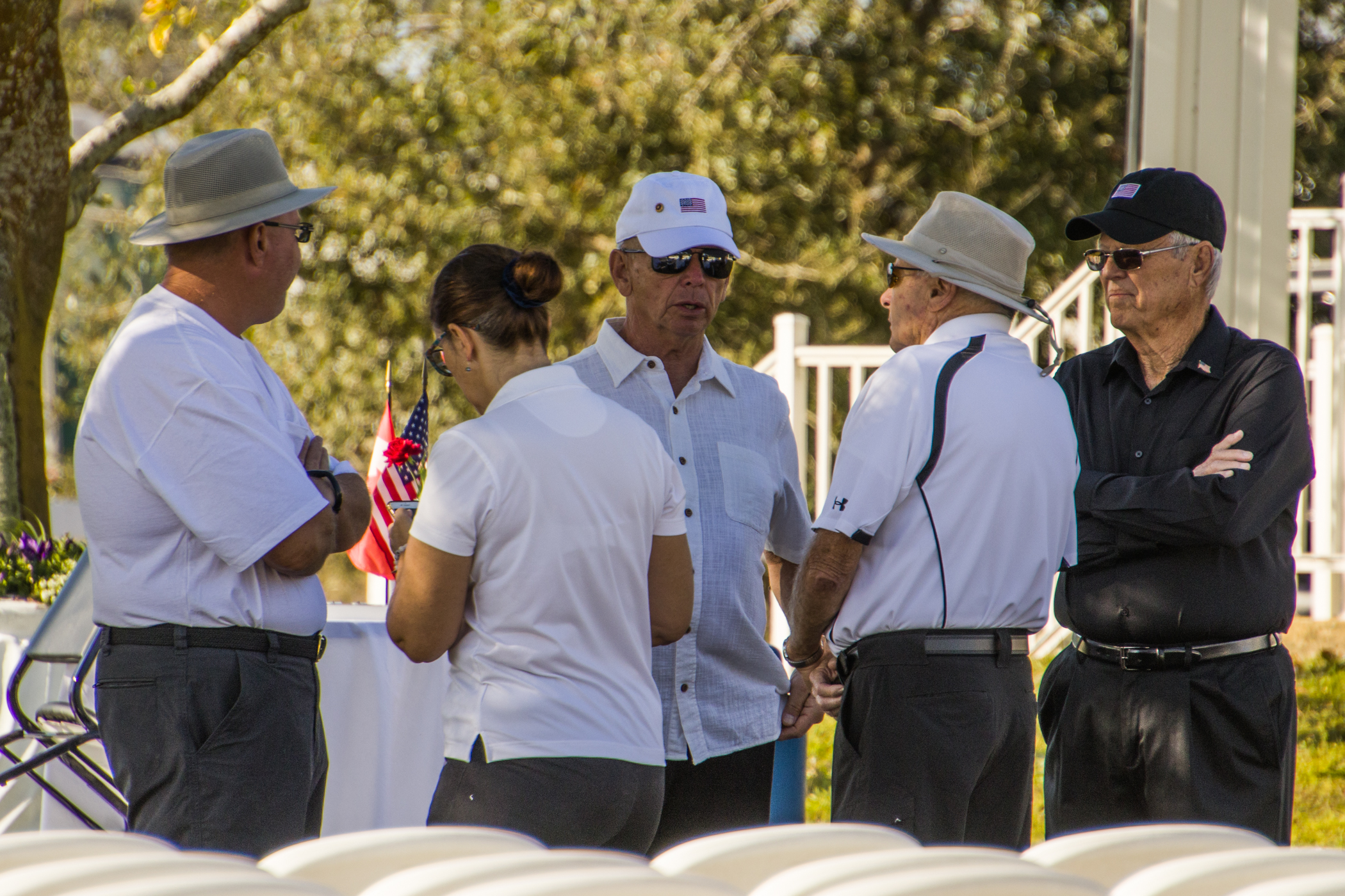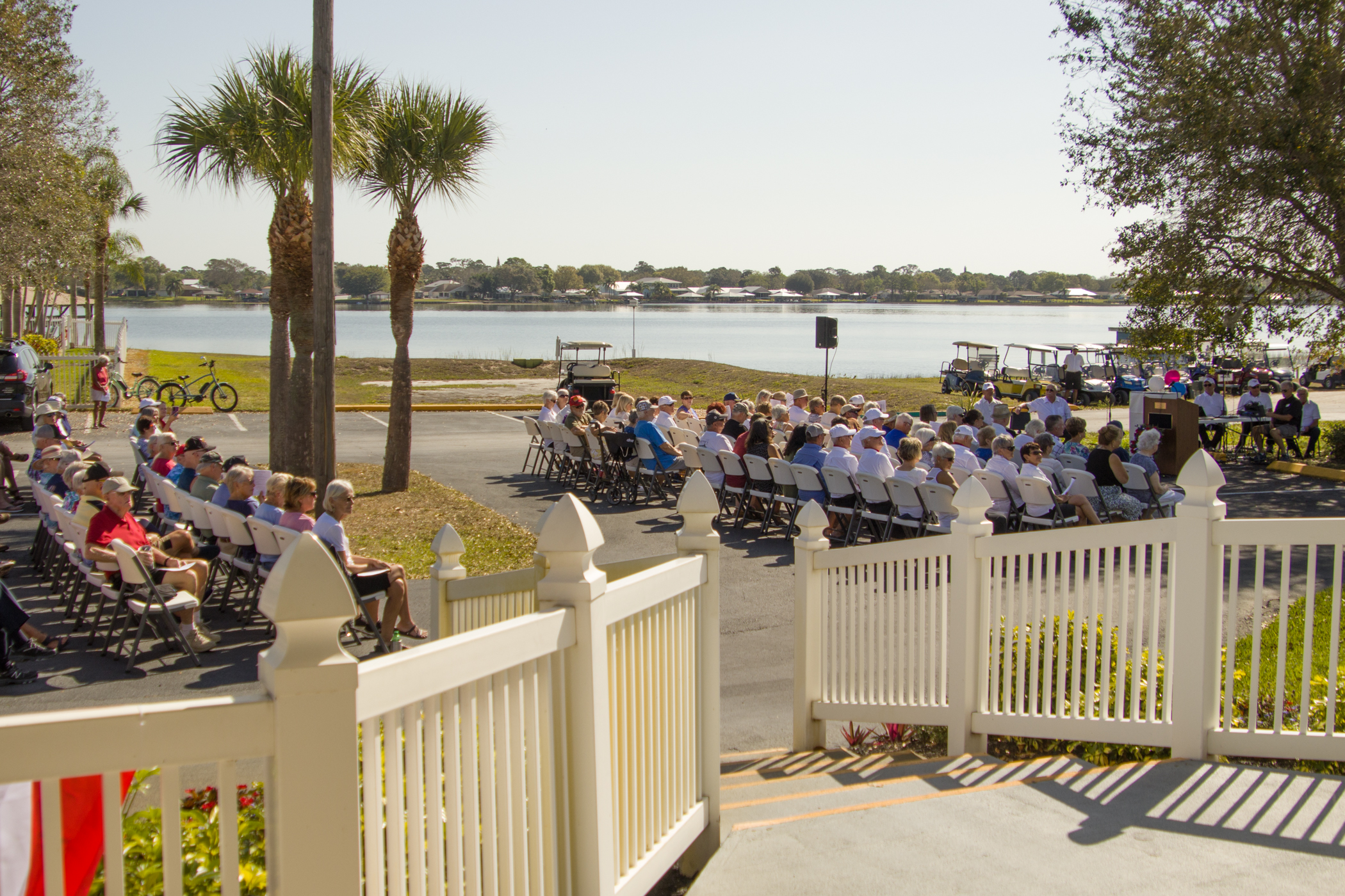 Just prior to the beginning of the event, one of our Bald Eagles flew over the gathering and perched magnificently in a pine tree by the lake, looking with anticipation at what was about to happen. He remained there through part of the ceremony, flying back over to the nest near the time of the honoring of the POAs/MIAs.