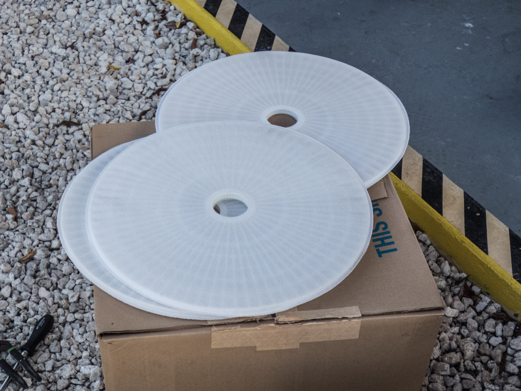 The last step is to replace the old, dirty disks with new, clean, 10-inch round filter disks.