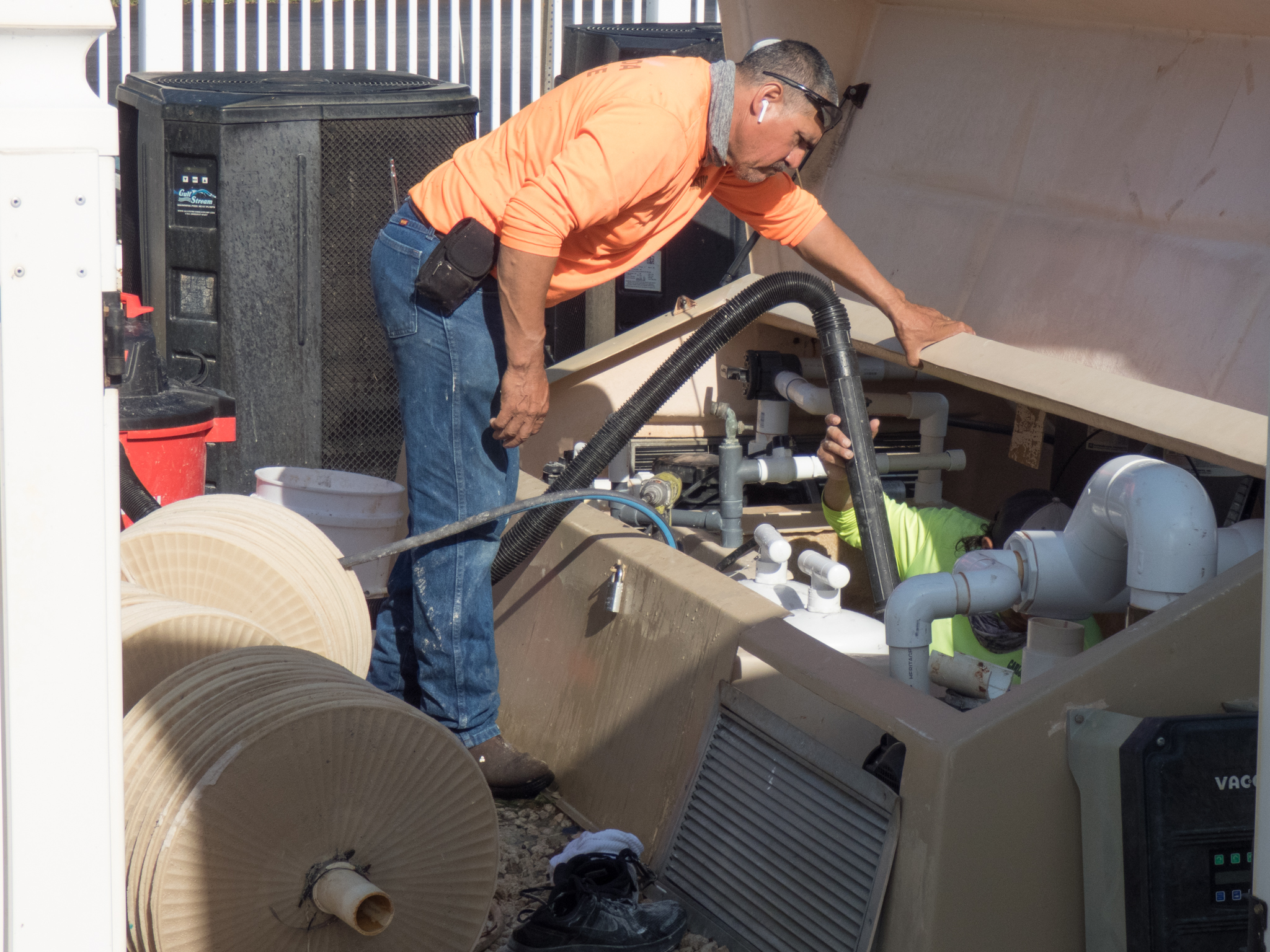 First, the water needs to be removed from the filter hole. I was too late to get a shot of that… But, the vacuuming continues during the process to ensure that that water doesn’t creep in on Carlos. Once the water is removed, the old filters are taken out.