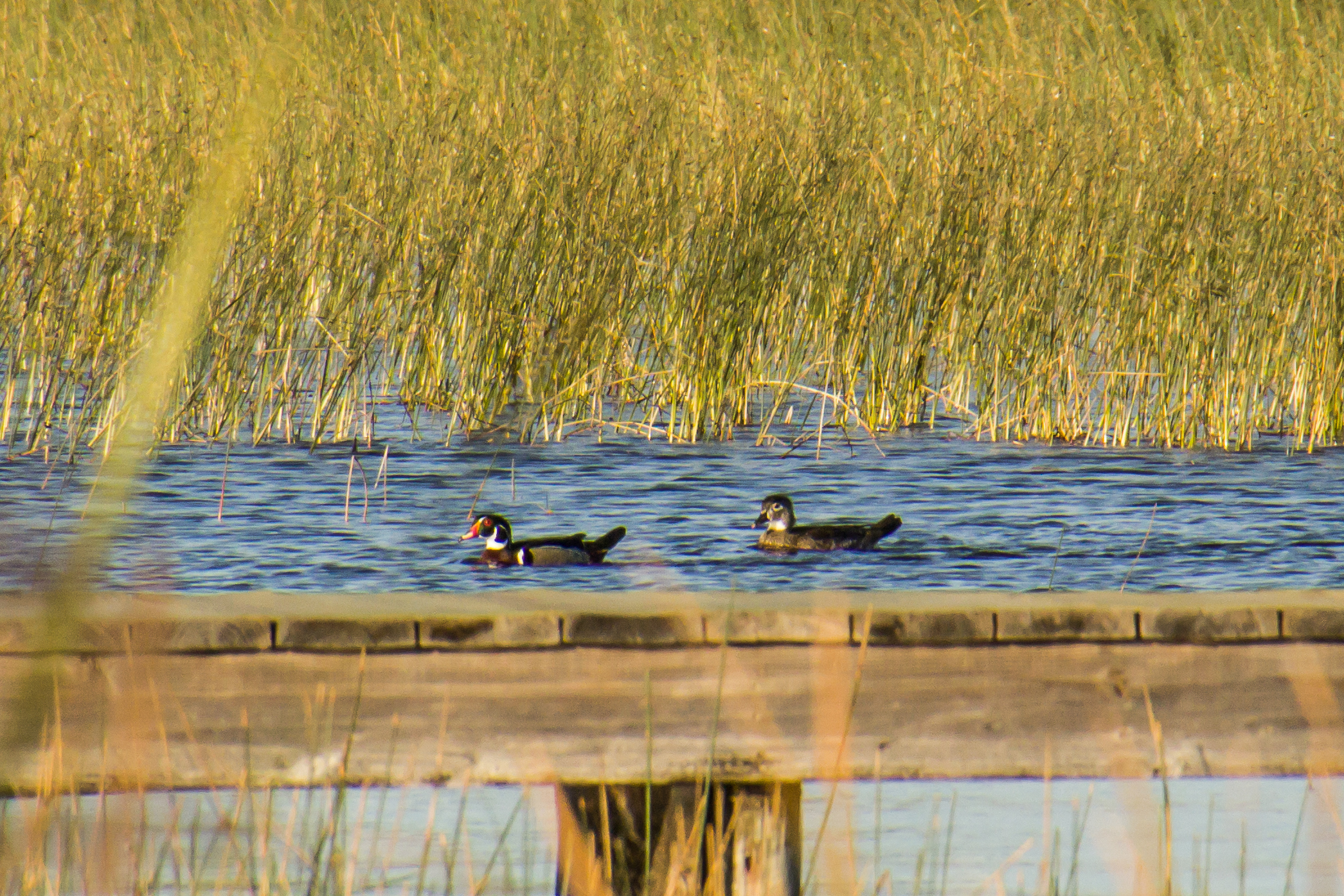 If you look to the water, you might see a Pied-billed Grebe fishing near the shore. Many beautiful Wood Ducks call Grassy Lake home. Mottled Ducks nest along our shore. Great Egrets, Little Blue Herons, Green Herons, and Tricolored Herons love to hunt in the reeds. Anhingas and Double-crested Cormorants are often fishing out near the middle of the lake, and you may see them sitting on one of the docks with their wings spread out, drying their feathers after a successful dinner dive. Herring Gulls and Ring-billed Gulls also fish in the lake.