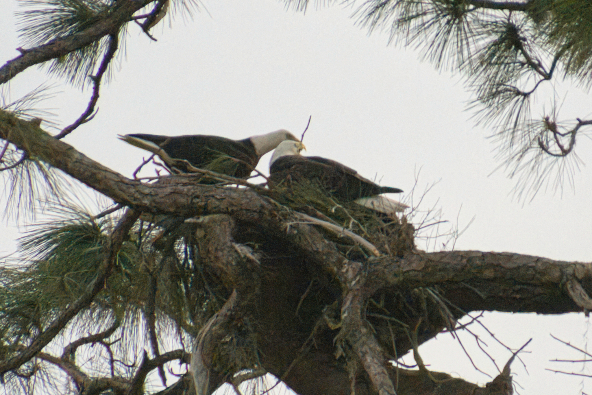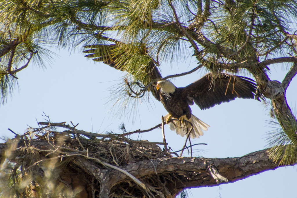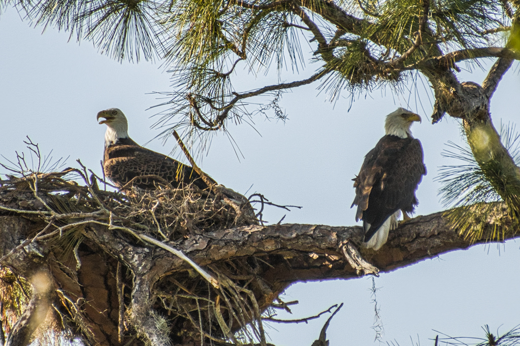 Hurricane Ian totally destroyed the nest in early October. Shortly after the hurricane, an “intruder” male eagle was observed on and near the nest tree. This was a cause for concern since Bald Eagles are very territorial. Some skirmishes were observed with the three eagles. At one point, two of the eagles began building an alternate nest in a large pine tree by the lake. However, they soon abandoned that idea and returned to building at their old location. The third eagle was still seen occasionally during this time period.