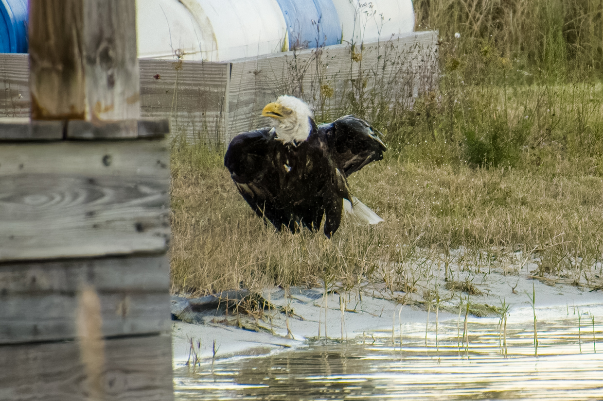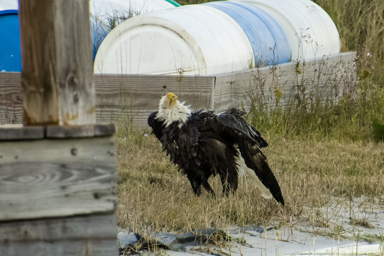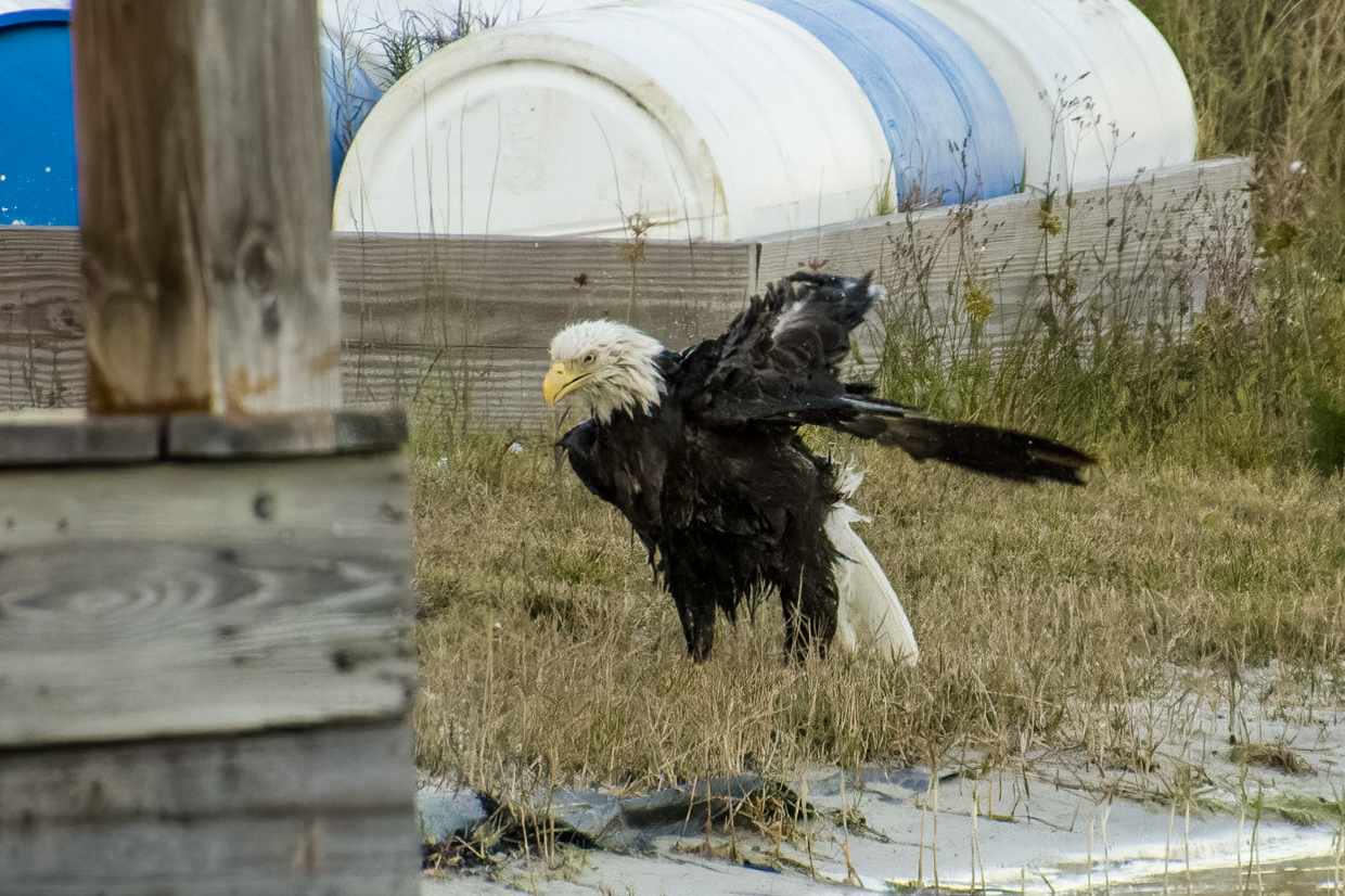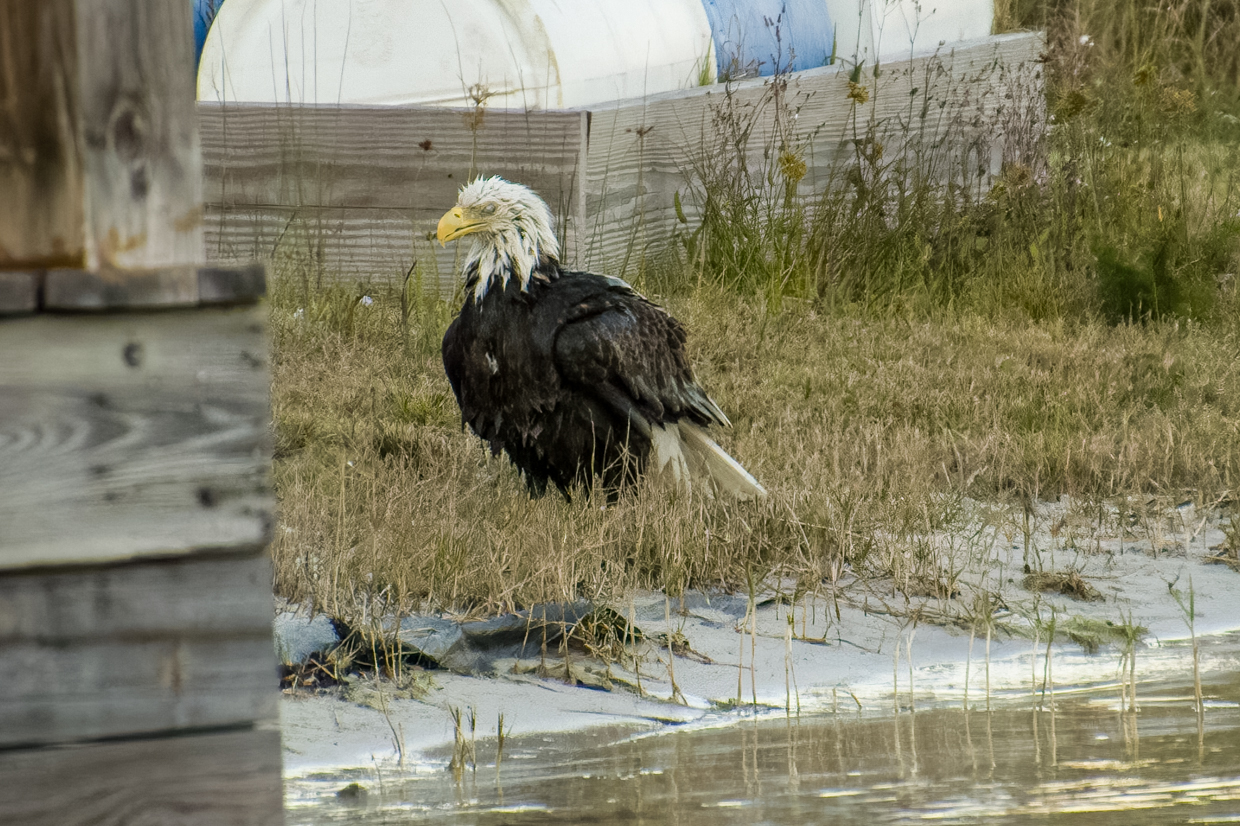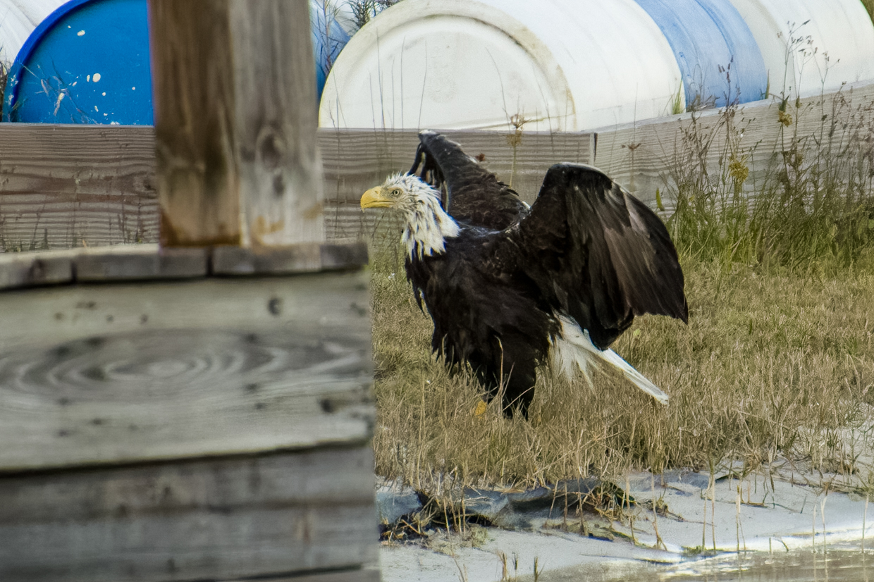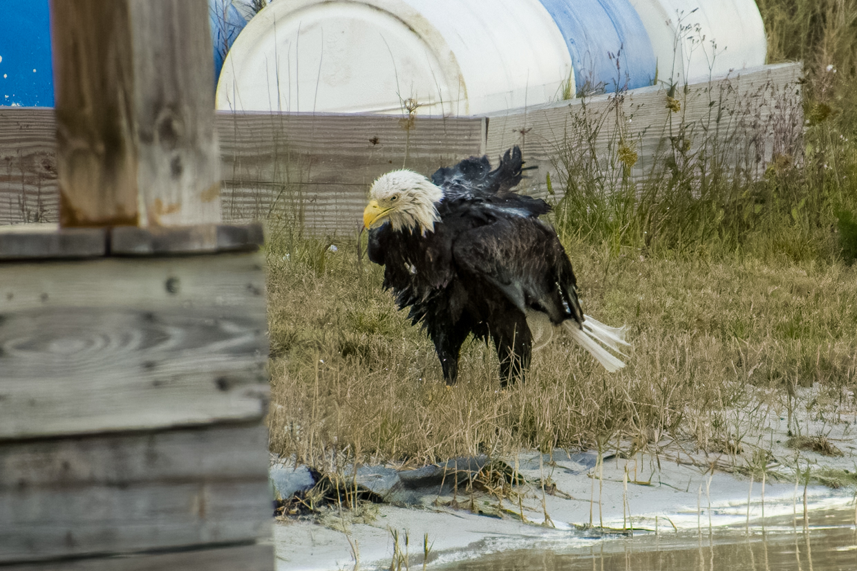 All new Moms deserve a day at the Spa to get a break from the kids. Liberty, our female Bald Eagle, certainly took advantage of that break time a few evenings ago. And it’s pretty obvious that she really enjoyed her bath! She took a lot of time shaking off the water on the shore before she flew up in the tree to dry off.