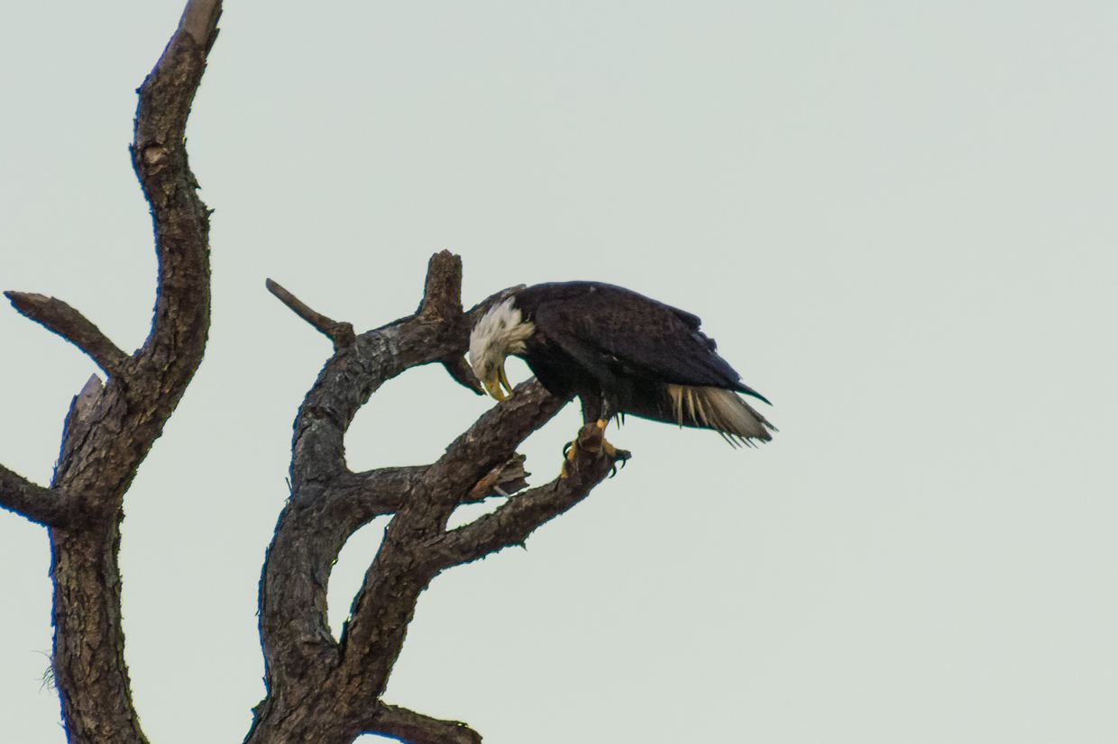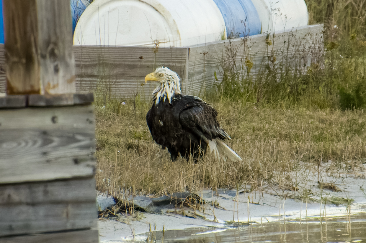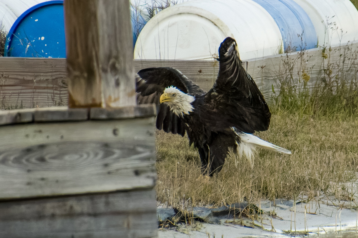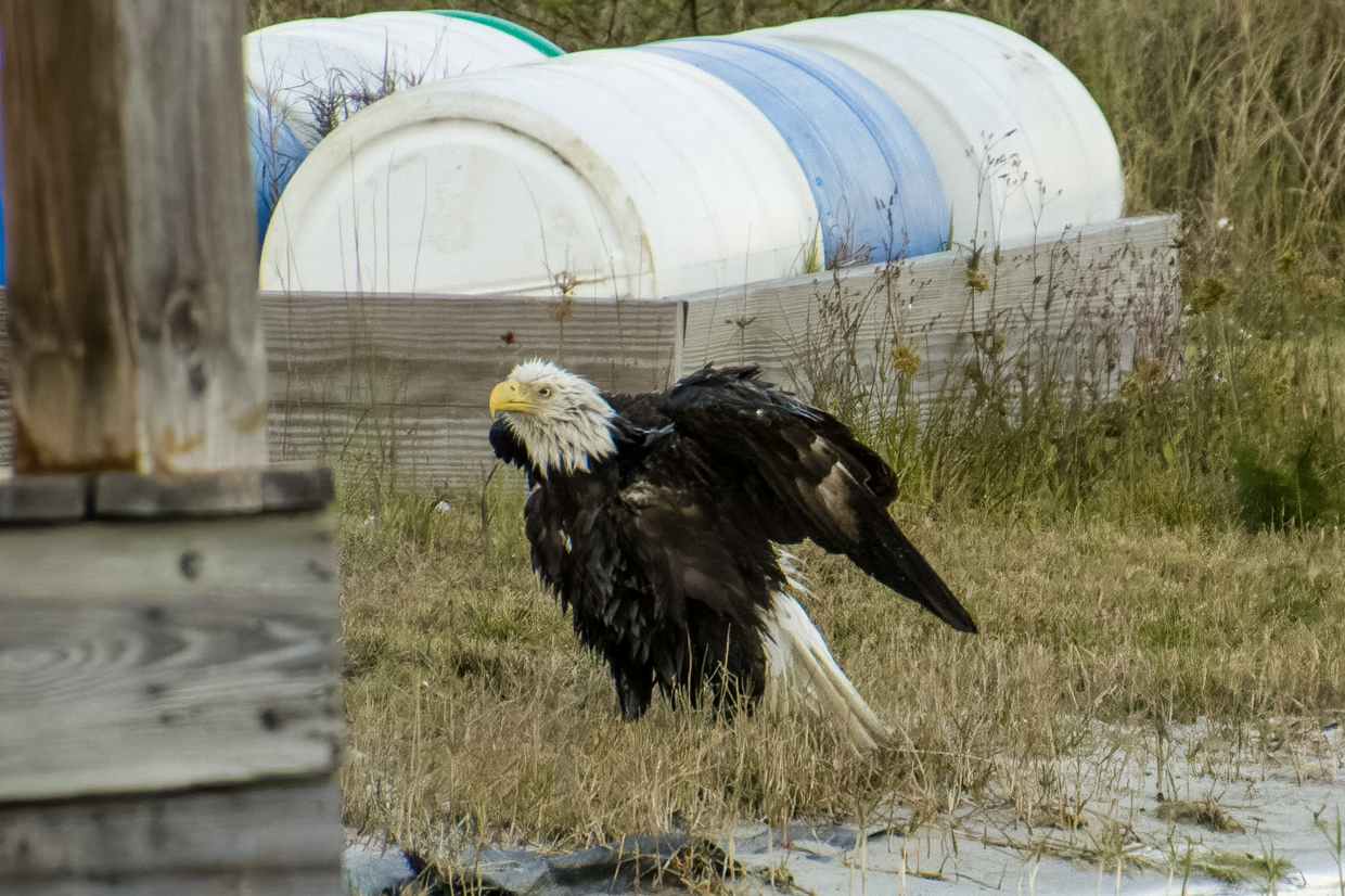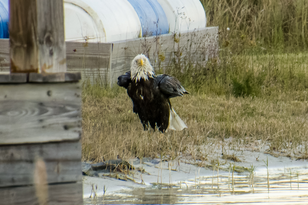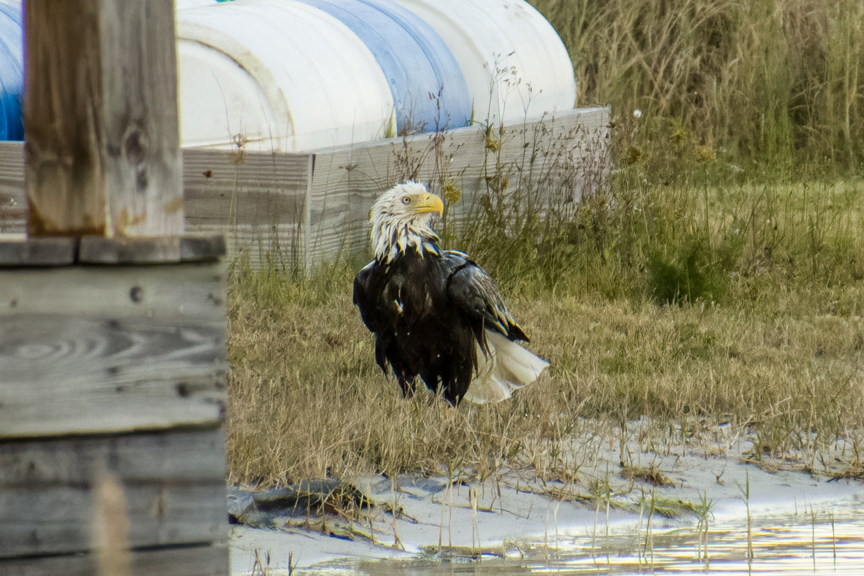 All new Moms deserve a day at the Spa to get a break from the kids. Liberty, our female Bald Eagle, certainly took advantage of that break time a few evenings ago. And it’s pretty obvious that she really enjoyed her bath! She took a lot of time shaking off the water on the shore before she flew up in the tree to dry off.